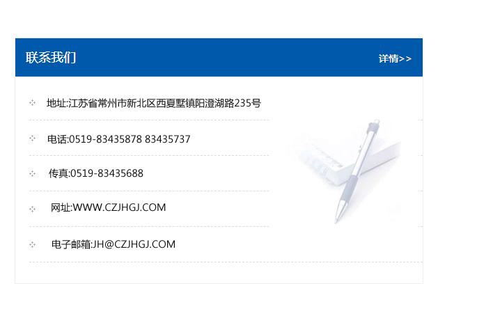 地址:常州市新北區友邦商務大廈1幢16、17層  電話:0519-85101652  傳真:0519-85112595  郵編:213022  網址:www_cz-jiayue_cn.mgyxsb.com  郵箱:xiajifengaa@163.com